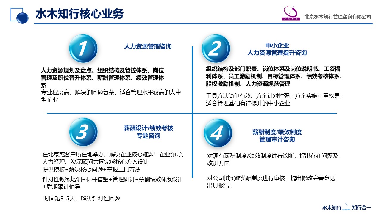 北京水木知行管理咨詢有限公司(www.bjsmzx_com.iwelldone.cn)專注提供人力資源管理咨詢、人力資源管理培訓、人力資源招聘咨詢、人力資源獵頭服務業務;咨詢業務范圍包括組織結構與管控體系、崗位管理體系、薪酬管理體系、績效管理體系,咨詢形式包括全過程咨詢、教練式咨詢和特訓班;培訓業務包括企業基礎管理...[詳情]